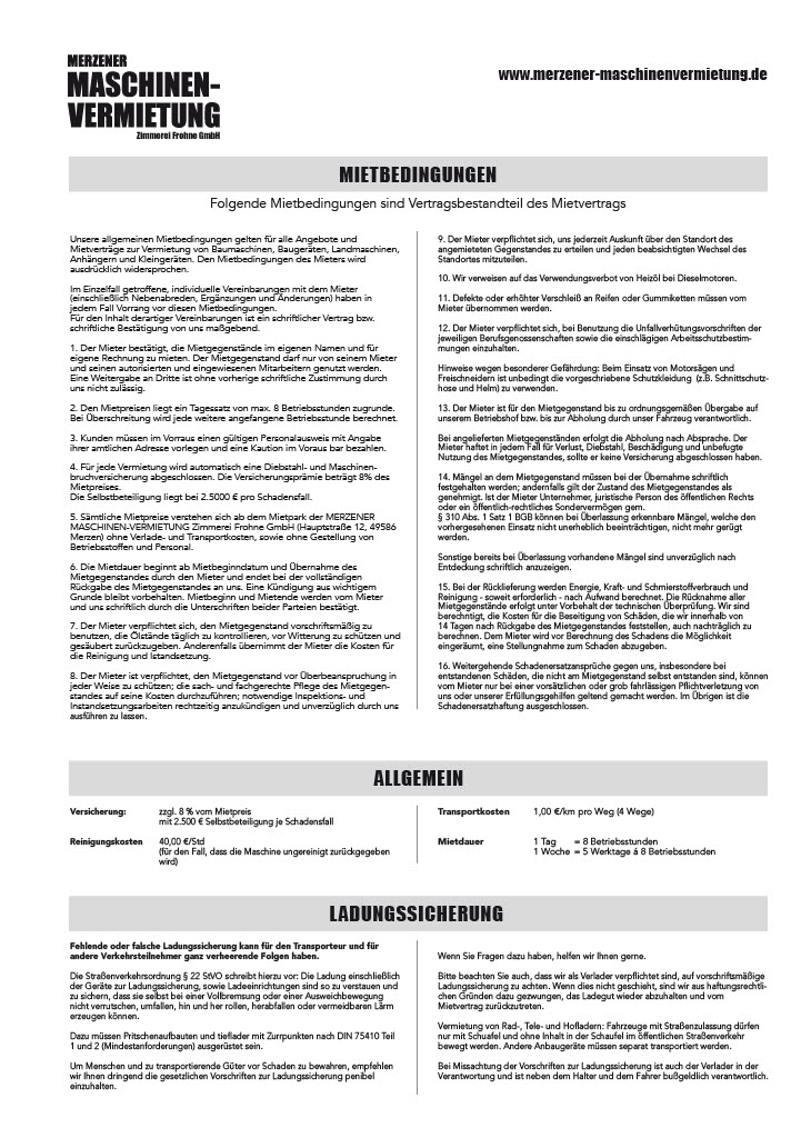 8% vom Mietpreis fallen grundsätzlich zusätzlich für eine Maschinenbruchversicherung an (zzgl. einer Selbstkostenbeteiligung im Schadensfall). Im Schadensfall ersetzt die Maschinenbruchversicherung die Kosten für die Reparatur.